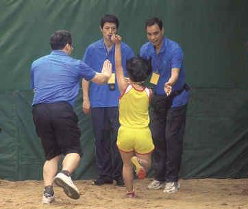 在广州市盲人学校举行的跑步测试,多名考官在迎接一名冲刺的学生。