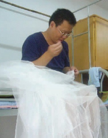 生科院的家长乔爸爸,则淡定地坐在上铺的床位上,穿针引线。他的腿上铺满了白色的蚊帐,猛地一看,就像在为闺女缝制婚纱。