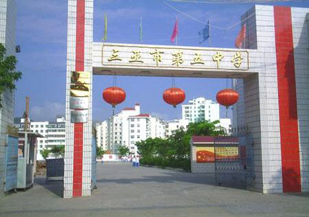 三亚市第五中学现为初级中学,创办于一九九三年,现有42个教学班,在校学生人数2220人。教职工 133人,其中教师123人,有53人为大学本科学历,研究生3人,高级教师8人,一级教师35人;学校占地面积25亩,建筑面积为12930平方米。目前教学大楼三栋,学生电脑网络室2间,多媒体教室1间 ,物理实验室2间,化学实验室1间,生物实验室1间,语音室1间,乐器室1间。