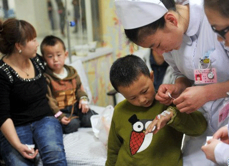 10月23日,在宁夏回族自治区人民医院,护士在给一名患儿输液。当日,宁夏回族自治区银川市金凤区锦绣幼儿园发生疑似食物中毒事件,59名师生在早餐后出现嗜睡、头晕、口干症状,随后被送往医院救治。截至目前,收治的59名患者中除2名患儿尚有嗜睡症状外,其余患者神志清醒,体征平稳。事件发生原因正在进一步调查中。