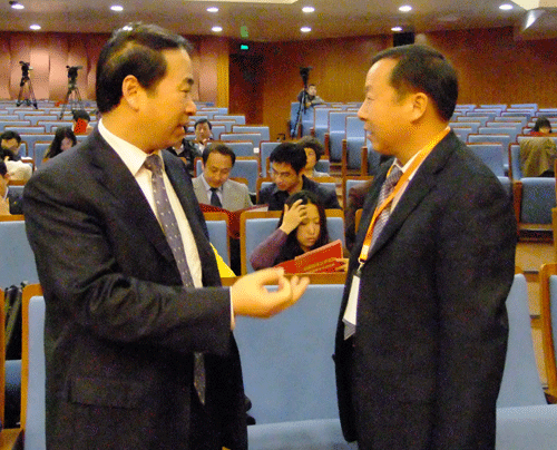 “2011教育之声论坛暨卓越校长年度盛典”前,教育部基础教育司一司副司长王定华与呼图壁县第四中学校长陈金龙亲切交谈