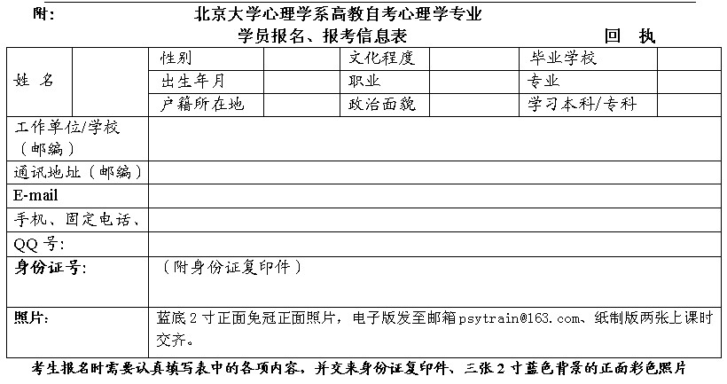 现在有假冒我们主考学校名义办心理学专业自学考试辅导班的,请考生一定留意,千万不要轻信,以 免上当受骗。我们只以北京大学心理学系的名义办辅导班,别的名义办的类似辅导班,均与我们无关。