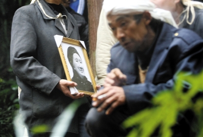 昨日,“爱情天梯”女主人公徐朝清的葬礼在家乡举行。图为儿子抱着母亲遗像送她上山。陈超 摄