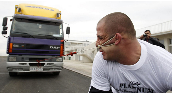 当地时间11月14日,格鲁吉亚Rustavi,格鲁吉亚男子Lasha Patarava试图用一只耳朵拉动一辆重达8.2吨卡车,以试图创造一个新的吉尼斯世界纪录。