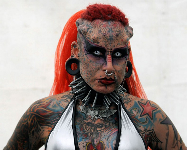 2012年9月22日,危地马拉城,来自墨西哥的被誉为“吸血鬼女人”的Maria Jose Cristerna与媒体见面。Maria打破了女性身体人为改变最多的吉尼斯世界纪录。