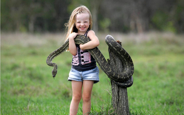 澳大利亚Maryborough,3岁的女孩Haileigh和3.7米长的蟒蛇Murray成为好朋友,虽然蟒蛇的长度是Haileigh身高的三倍,不过Haileigh可以随意地抱着蟒蛇或者和它一起玩耍。她的继父称,蟒蛇已经10岁,十分温驯,从来不曾咬人。