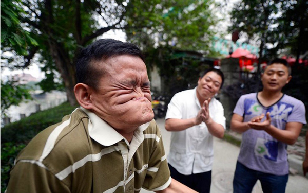 2012年6月5日,四川省成都市,“烂脸王”汤术全表演嘴巴吃鼻子迎来市民掌声。当日,成都“烂脸王”汤术全打进报社热线向有变脸绝技的市民发出挑战,如果获胜,对方可以得到10万元的奖励。