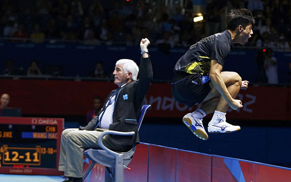 从2011年5月的鹿特丹到2012年的伦敦,张继科仅仅用了1年3个月的时间,成为历史上第四位乒乓球大满贯得主,也是用时最短的大满贯。血性的张继科,正以火箭般窜升的速度,成就自己的乒乓霸业。图为当地时间8月2日,2012年伦敦奥运会乒乓球男单决赛,张继科以4:1战胜队友王皓夺冠后庆祝胜利。
