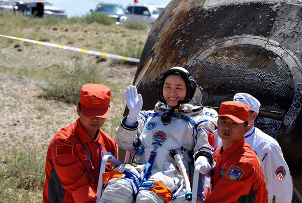 她还有另一个外号叫“神女”。34岁的刘洋,看似娇弱,却成功登陆神九,飞向太空,成为中国女性“飞天”第一人。图为2012年6月29日10时许,神九载人飞船返回舱在内蒙古主着陆场安全着陆,天宫一号与神九载人交会对接任务取得圆满成功,航天员刘洋出舱后挥手致意。