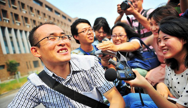 大庆“保安哥”訾立,1985年出生,高二辍学回家种地,做过建筑工,当过学徒。一个求学梦,数载备考路,最终,他以620分的成绩成功考入天津大学。原来,只要信念加努力,保安也有“逆袭”的一天。图为2012年8月30日,天津,“保安哥”訾立成为媒体追逐的对象。
