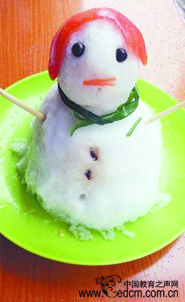 帽子和嘴巴是番茄皮,眼睛和纽扣是树果子,围脖是绿葱,两根筷子就是胳膊,刘小姐被这个小雪人的可爱样子萌到,经打听,原来雪人是老板一时兴起自己做的,刚好“盛”在快餐店的餐盘里,成了一道“可口”的小菜。(史凤玲)