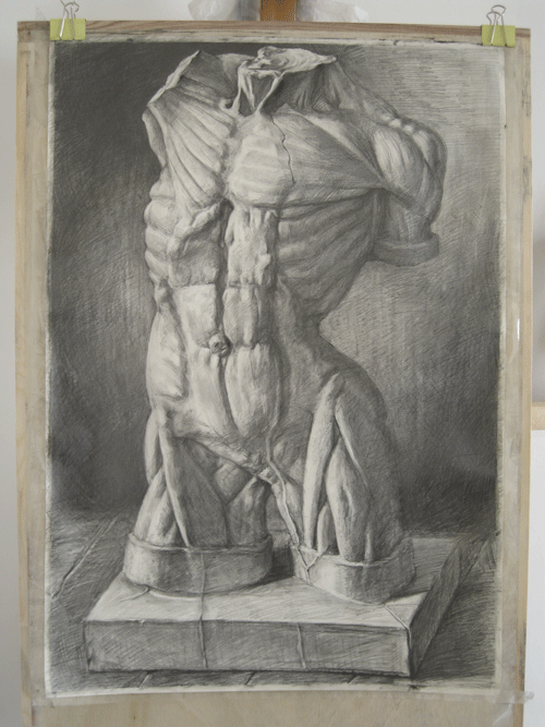 我叫张博文(编号12007),今年18岁,爱好绘画、电影、音乐。最喜欢的艺术家是米开朗琪罗,其著名的作品《大卫》,展示了人类的充满力量的体格魅力,我的这幅作品便是受《大卫》的启发。