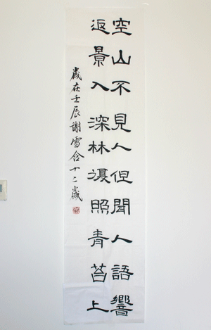 谢雪含,女,12岁,杭州英特外国语学校。业余爱好兴趣广泛,她酷爱书画,具有一定的艺术天赋,她的书画作品在学校、省级以及全国性的书画比赛中多次获奖。2007年谢雪含在学校书法范进老师的带领下,参加了武汉的书画现场决赛。由于功底扎实,发挥出色,谢雪含同学的作品得到了现场评委“佳作点评”的机会,一举夺得金杯!并在书法报、书法热线网、拱墅教育网等报纸、网站媒体给予了详细报道。2008、2009、2010、2011、2012年也分别在教育部、江西省美协、中国美协、杭州拱墅区教育局等主办的书画大奖赛获得多种奖项,是一名书画小能手!