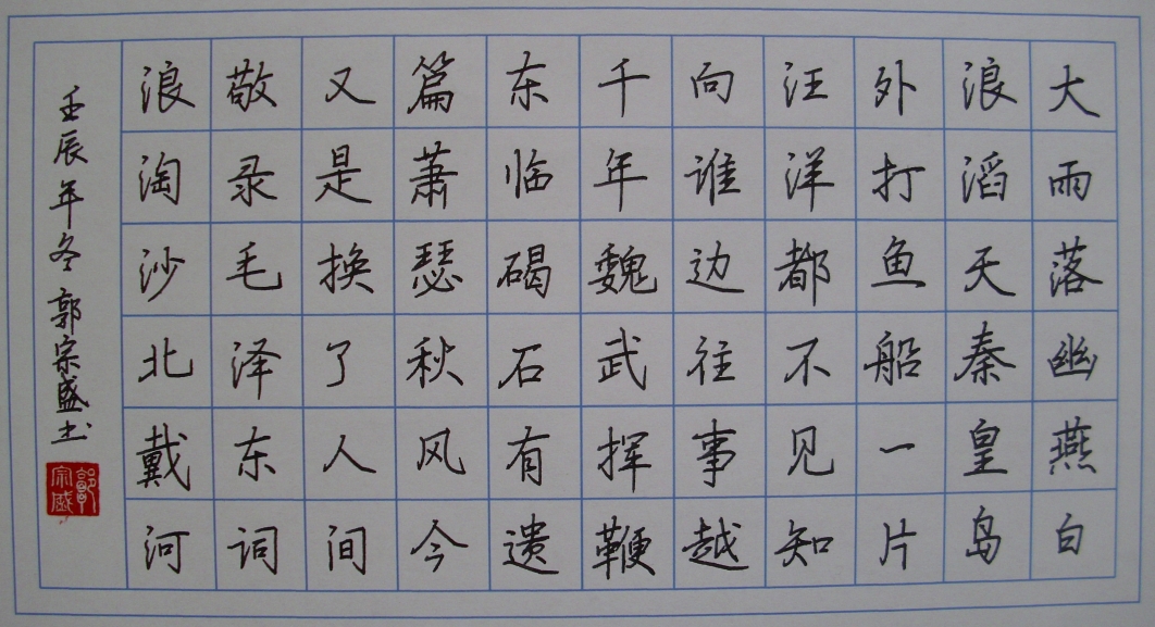 郭宗盛,男,1993年2月22日出生,福建省厦门集美大学。从小学开始就在书法老师的带领下学习硬笔书法,对书法有浓厚的兴趣,其他兴趣也挺广泛的,比如打球,游泳等。曾获2009年巨人杯首届全国大中小学生规范汉字书写大赛初中组硬笔类二等奖,福建省特等奖。第二届全国学生规范汉字书写大赛福建省三等奖。2011年纪念福建省红十字组织建会100周年冠捷杯文学征文绘画书法摄影作品大赛校园类中学组书法一等奖。第六届全国规范汉字书写大赛中学中专组硬笔字二等奖。在学校书法比赛中也频频获奖。