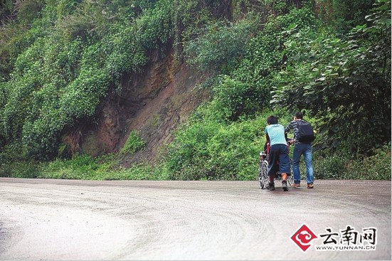 富源县城外的320国道坡度大,一网友帮樊蒙推轮椅。