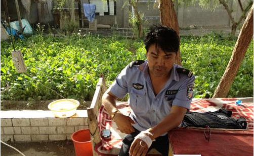 这是墨玉县公安局芒来乡派出所所长艾合麦提托合提 麦提图尔荪同志牺牲前三天(7月8日)留下的照片,当时他正在派出所值班桌前打针,派出所的民警用手机记录下了这一幕。没想到,三天后的7月12日,他在走访巡查期间,因过度劳累突发心脏病抢救无效,献出年仅43岁的生命。