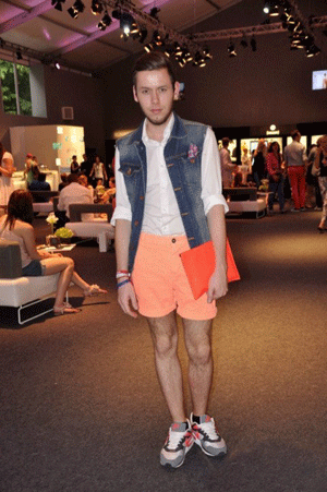 荧光橘黄色的短裤充满了运动感觉,这个哥们儿就真的搭配了一双运动鞋,感觉活力十足,而且还冲淡了彩色裤子的娘味儿。