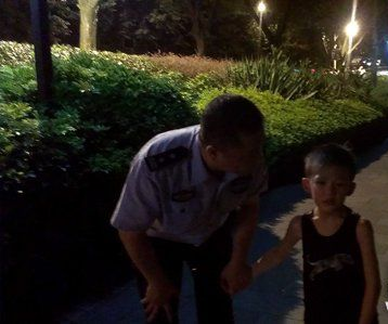 民警领着哭泣的小男孩在西湖公园找爸爸