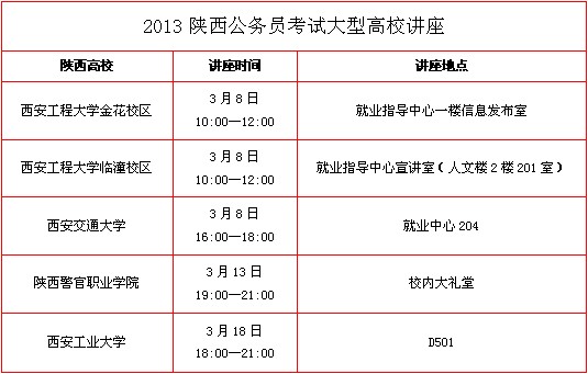 【必威体育官网网页版 3月8日消息】2013陕西公务员考试笔试时间预计在4月份,如今已进入紧张的备考阶段。为了帮助广大考生更好的备考,陕西省就业指导中心特举办了2013陕西公务员考试大型高校讲座。具体安排如下: