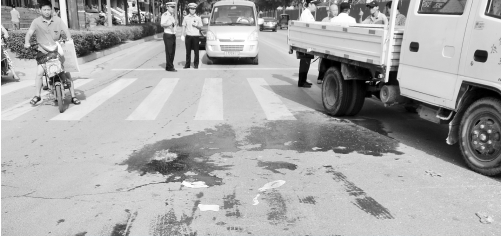 昨天上午9点,郑州市交巡警二大队民警在事发现场处理此事。一辆车牌号为豫APK682的白色小货车停在路上,车身印有“郑州市市政管理处”字样,车后拖着一条6米多长的刹车印。车东南侧约3米处,有一大片红色血迹。