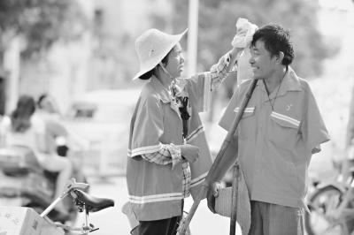 昨日,陈良军清扫马路时汗流浃背,妻子李小慧拿出毛巾为他轻轻擦汗 记者刘斌 摄 (信息来源:顾丹)
