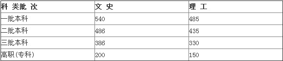 理科:一本485分,二本435分,三本330分,高职(专科)150分。