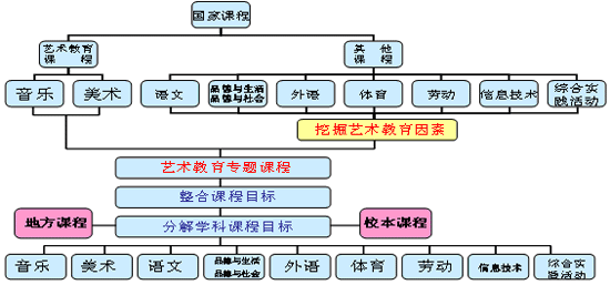 学校整体把控,带领教师先将国家课程中非艺术教育课程中的艺术教育因素挖掘出来,与艺术教育课程整合,共同梳理、合并成“艺术教育专题课程”。通过整合相关课程目标,重新分解到不同学科课程中,做到课程内容无重复。
