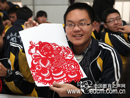 讲解完毕,学生们都跃跃欲试,想在蜡板上一显身手。在各位民间剪纸艺术家的指导下,学生们一丝不苟地操作着手中的刻刀和红纸。由于是第一次接触到剪纸,同学们普遍不太熟练,听的时候觉得没问题,可一下刀就觉得有点手足无措,有的还由于“业务不精”剪出了一幅“四不像”,但是他们个个神情专注,在老师的精心辅导下,终于刻出了满意的“作品”。