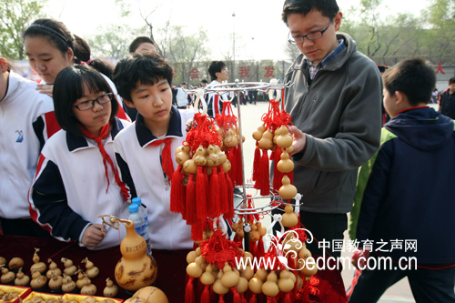 起源于西汉的烙画工艺的是用电烙铁在葫芦上烫出花纹,第一次见识这种工艺的学生们紧紧围着技艺大师“瞧新鲜”,几个大胆的女生体验了一把“画匠”的感觉。“用电烙铁‘下笔’时千万不要太快,慢慢来”,烙画工艺大师栾老师细心嘱咐体验的学生。“这种在葫芦上画工笔的艺术太美了。不过我是第一次尝试,画的时候就怕把葫芦烫糊了,火候不好掌握,估计我得练好几年才能见成效”,杨心一说。而她的同学刘玥珩也刚刚完成了自己的作品,“本来想画个雪人,结果没画好,改来改去成了小猫,制作起来挺有难度”,她说。