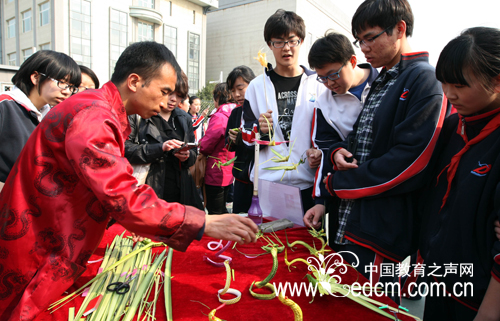 民间技艺大师在中学生传统文化校园日展示草编工艺制作
