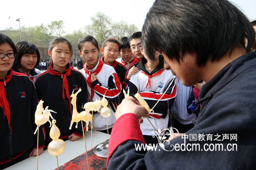 民间技艺大师在中学生传统文化校园日展示糖画糖人制作