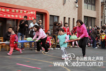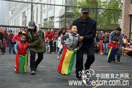 4月23日,北京市东城二幼亲子特色体育项目展示活动,家长与孩子一起进行口袋跳、运西瓜等体育游戏。东城二幼的“手拉手”友好校——平谷大华山幼儿园的孩子们也来到现场,展示起平谷当地具有民间特色的踩高跷、独轮车等体育项目。(吕晓晓)