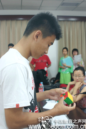 这位选手的才艺展示很特别——拧模仿,2分钟把两个被评委精心打乱的魔方归位,令现场观众赞叹不已