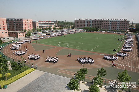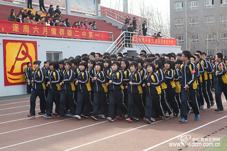 从起床到跑操仅仅10分钟,近万名学生到齐,无一人迟到。几十个方阵,队列整齐,步伐一致,口号震天,环操场跑操。抖擞的精神,昂扬的斗志,冲天的精气神,每一个方阵就是一个由人头组成的整体,随着步伐起伏,远看就像波动的海洋,涌动在400米的塑胶跑道上。这就是被网友冠为的“天下第一操”、“史上最震撼的跑操”、“堪比北京奥运会开幕式”……