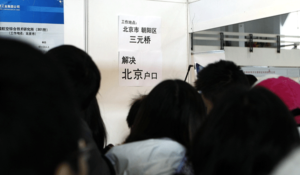 1月6日,某企业在招聘会现场贴出“解决北京户口”的条件,吸引了大批求职学生。中新社发 李慧思 摄