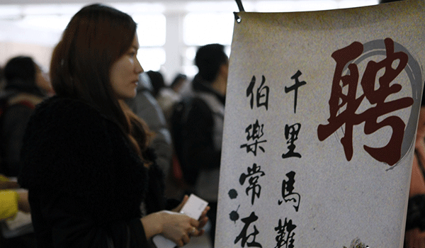 1月6日,一家公司打出了“千里马难寻,伯乐常在”的宣传牌吸引求职学生。中新社发 李慧思 摄