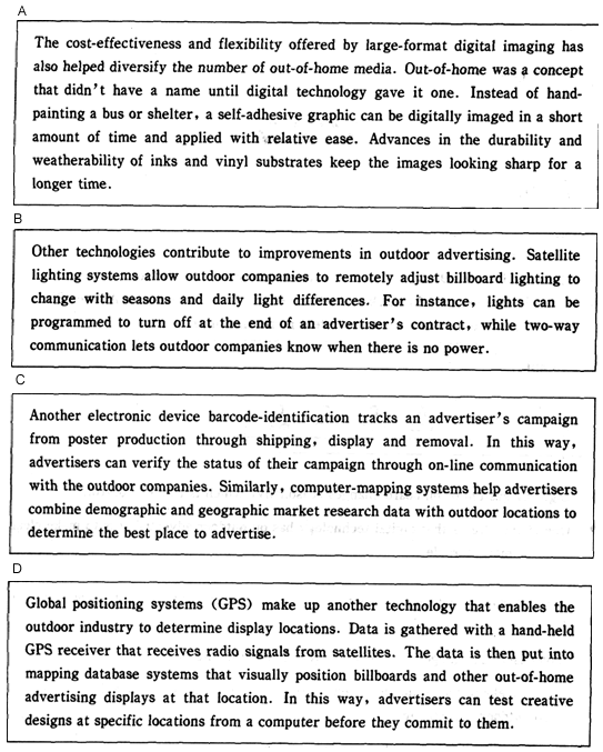 6 By using electronic technique, advertisers can find the most suitable display position to do outdoor advertising.