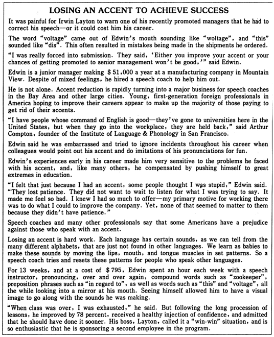 13 How did Mr. Edwin's accent bring trouble to his work?