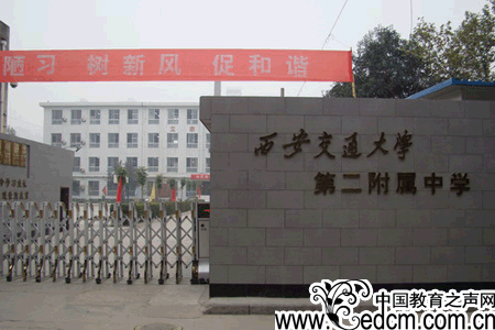 西安交通大学第二附属中学位于西安市小寨文化圈中心位置,坐落在西安交大医学院学生区内,是一所交大直属的西安市唯一拥有双道门禁保卫、独具高校文化浸染的完全中学,属西安市重点中学、陕西省普通高中标准化学校。