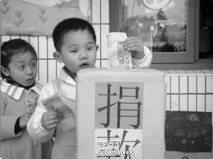 北京某幼儿园学生家长吴先生向媒体爆料,22 日,孩子从幼儿园拿回来一张通知书,上面写着“为地震捐款,数额不限”。吴先生让孩子把储蓄罐里的零钱共30多元捐了。结果,晚上孩子回来说:老师说捐得少了,应向捐得多的小朋友学习,捐红色的钱。而在丰台区另一所初中,老师拿本子登记学生捐款数,很多学生跟风捐款超百元。