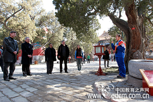 在孔庙,国子监中学双语导游志愿者主动为来华访问到此参观的法国巴黎学区次长一行,用英语进行讲解