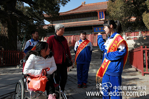 在孔庙,国子监中学双语导游志愿者主动为来京旅游的外地游客进行讲解