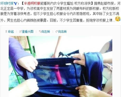 近日,河北省石家庄市正定县第一中学陷入“透明校服门”。据媒体报道,该校近日为高中生发放了两套材质为网眼布料的新校服,由于校服过于轻薄,“学生穿着时甚至可以看到内衣的颜色与轮廓”,致不少学生因害羞而拒穿。