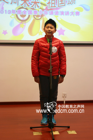 少年组的李东乐头顶冲锋头,身穿大红上衣,打扮很潮,但不妨碍卖萌!他朗诵的是《献给祖国的诗》