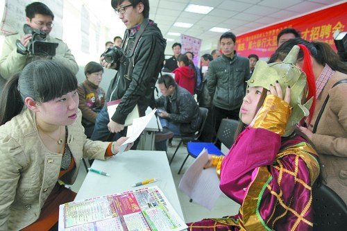有意思的是,进场求职的5000余人中,男士占了近一半。为在求职时第一时间吸引到用人单位,还有女大学生扮起花木兰求关注。