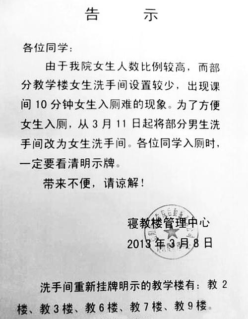 昨日,记者来到信阳师范学院的教2楼,在教学楼门口看到一张告示:由于我院女生人数比例较高,而部分教学楼女生洗手间设置较少,出现课间10分钟女生入厕难的现象。为了方便女生入厕,从3月11日起将部分男生洗手间改为女生洗手间。各位同学入厕时,一定要看清明示牌。带来不便,请谅解。