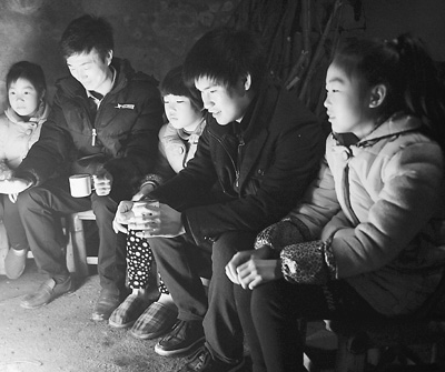 图为金菊小学教师朱文君(左二)和曾祥志(右二)家访时与学生一起在寒夜烤火。