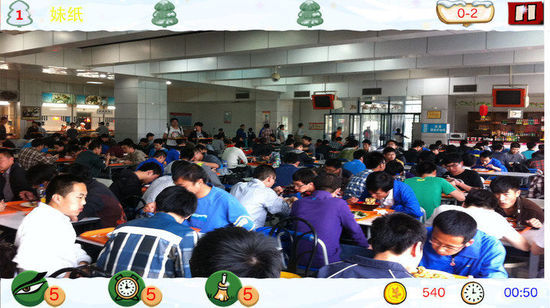 这张真人版“找你妹”拍摄于西北工业大学的食堂。食堂里全是人,但放眼望去,女生在哪里?作者在图片的上下方加上“找你妹”的游戏背景画面。在图片的右下角,显示已得到540分,还剩下50秒。