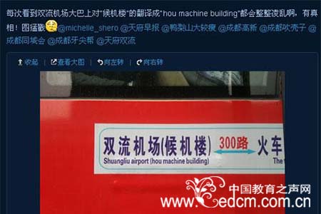 今日上午9:13,新浪微博网友@ZYOSEN发微博称,从火车北站开往双流机场(候机楼)的大巴300路车身始终点提示,把“候机楼”翻译成“hou machine building”,汉语拼音加英语直译,有明显的翻译错误。