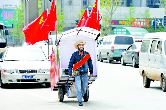 昨日上午,记者看到严家满时,他正拉着一辆由崭新板车改装成的棚车,棚车三面都印着网络上盛传的“板车哥”标准照片,车顶插着6面红旗。板车一角放着一个透明募捐箱。